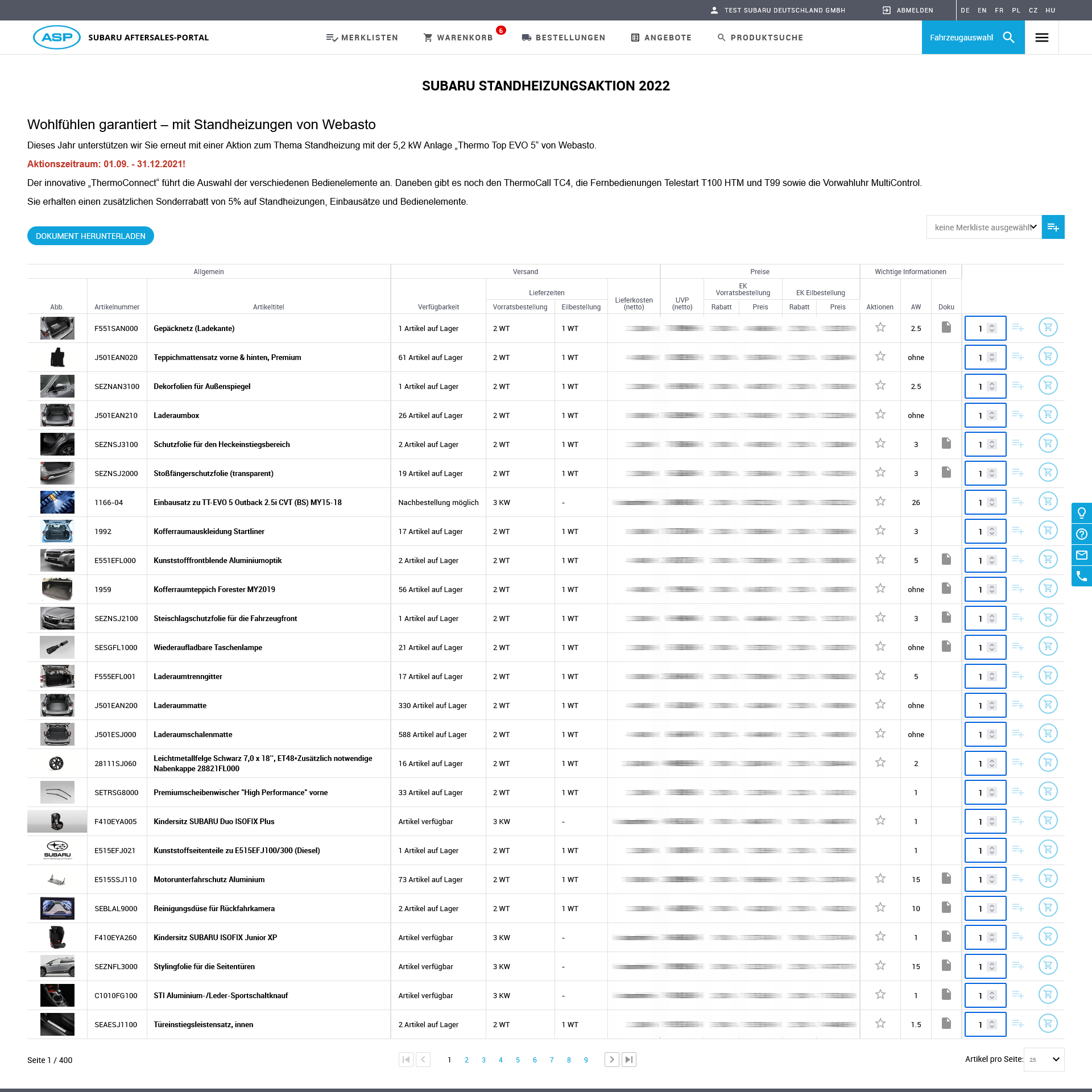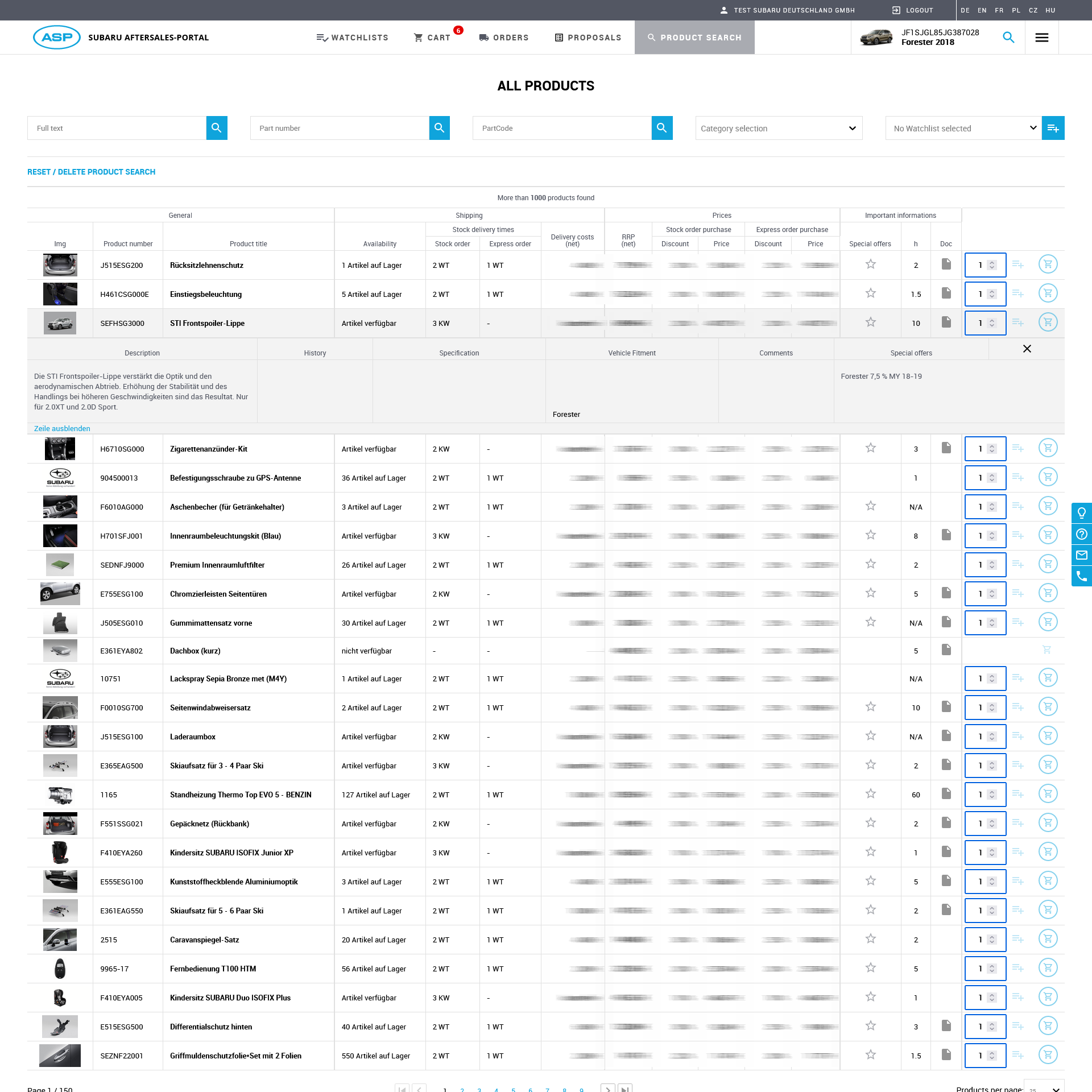 ASP kommuniziert in Echtzeit mit dem Warenwirtschaftssystem von Subaru Deutschland. Die Subaru Partner erhalten dadurch Auskünfte über Preise, Rabatte, Lagerbestände und Lieferzeiten.