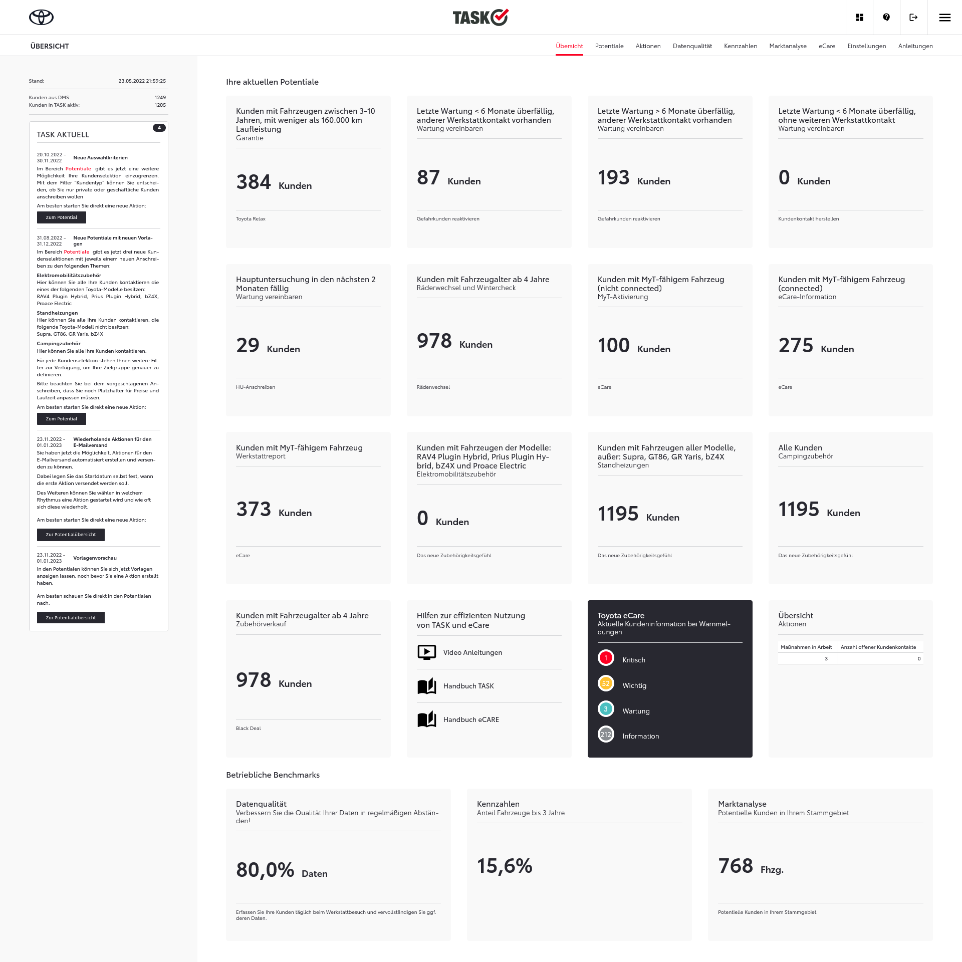TASK steht für „Toyota aktive systematische Kundenbetreuung“ im Aftersales und bietet den Toyota Händlern eine Plattform, um Kunden einfach und passgenau anzusprechen. Dafür erhalten sie Unterstützung durch die zentral zur Verfügung gestellten Inhalte und der automatischen Erfolgsmessung, die für jeden Kundenkontakt integriert ist. Anschreiben per E-Mail- + Brief sind zu 100% integriert und automatisierbar.