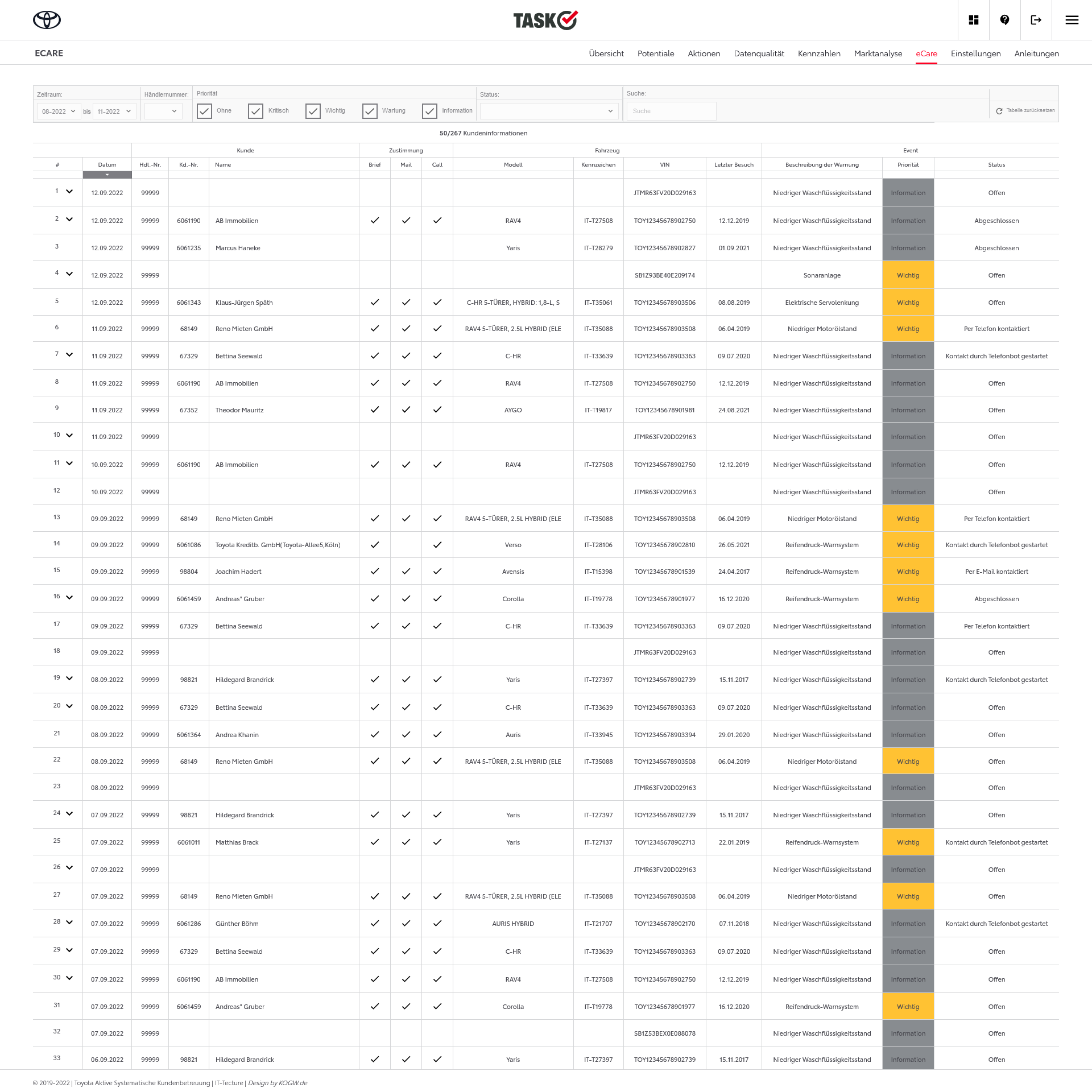 | Perspektive: | Durch Anbindung weiterer IT-Systeme aus dem Aftersalesbereich sollen für die Toyota Händler weitere Kontaktmöglichkeiten in TASK geschaffen werden. |
