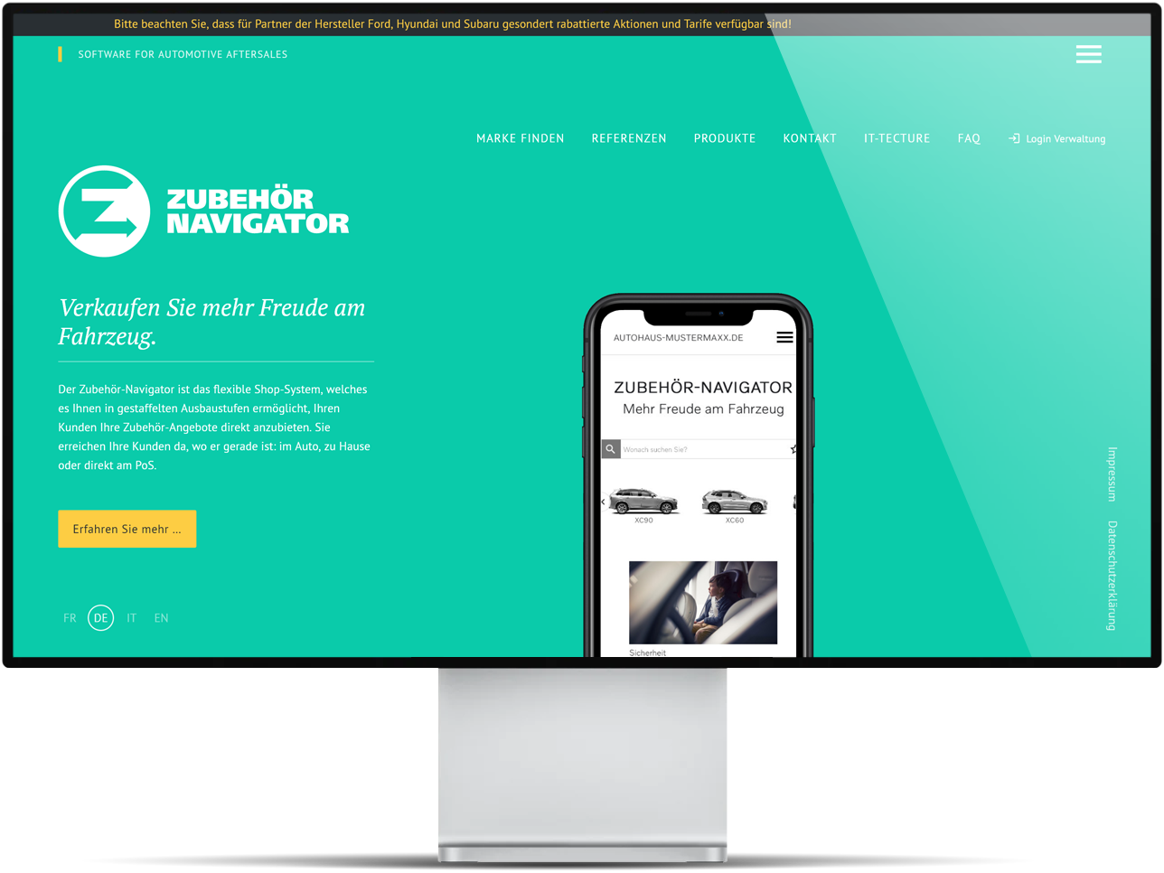 Der Zubehör-Navigator ist eine flexible E-Commerce Plattform, die auf die spezifischen Anforderungen des Original-Zubehör-Verkaufs ausgerichtet ist. Durch unser Omni-Channel-Prinzip erreichen Marken-Autohäuser ihre Kunden zuverlässig dort, wo und wann immer diese nach Zubehör suchen: zu Hause, unterwegs oder direkt im Autohaus vor Ort; bei der Individualisierung ihres Neu- oder Gebrauchtwagens oder zur Aufrüstung des bereits vorhandenen Fahrzeugs.